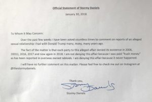 Zvonurile despre relatia lor au reapărut în ianuarie, când ziarul Wall Street Journal a raportat că a fost plătită să semneze un acord de nedivulgare în perioada premergatoare a alegerile din 2016, ceea ce a împiedicat-o să discute presupusa legătură.