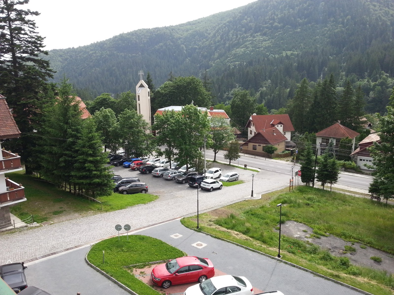 Luam in primire camera destul de repede si constatam ca din balconul acesteia ni se dezvaluie o mica parte a panoramei statiunii, cu munti inverziti si aer proaspat. E liniste deocamdata si speram sa ramana asa pe tot parcursul sederii noastre aici, chiar daca suntem destul de aproape de soseaua principala.