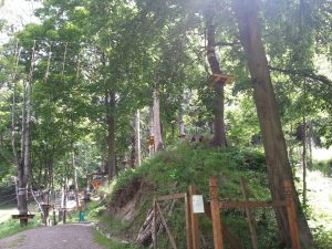 Coborand lungul sir de trepte, ne afundam din nou in racoarea binevenita a tufisurilor, dupa care iesim la lumina din nou, in apropierea lacului. In copacii care strajuiesc aleea care urmeaza treptelor si apoi inconjoara lacul, sunt instalate dispozitive felurite, specifice parcurilor de aventura, menite presupun, copiilor sau amatorilor. Nu facem parte dintre acestia, asa ca ne urmam calea.