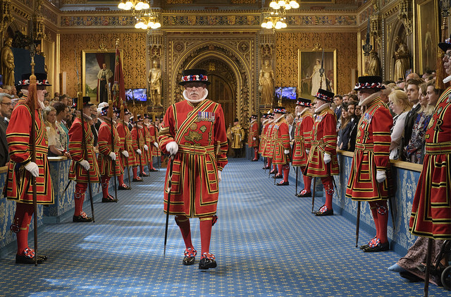 Garda regala Yeomen of the Guard. foto : UK Parliament.Momentul cand paznicii Yeomen of the Guard anunta ca au terminat ceremonia de verificare la beciurile moderne.