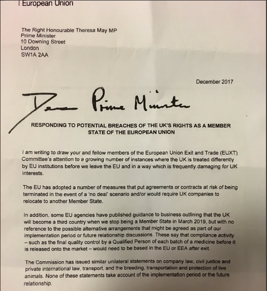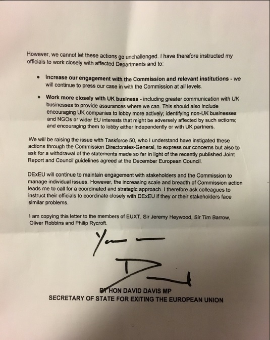 Scrisoarea ministrului britanic pentru Brexit catre Theresa May a fost facuta publica de catre ziarul Financial Times in care avertizeaza că interesele economice ale Marii Britanii sunt subminate de catre Uniunea Europeana care planuieste pentru o situatie in care nu va exista un pact economic intre UK si UE dupa Brexit.