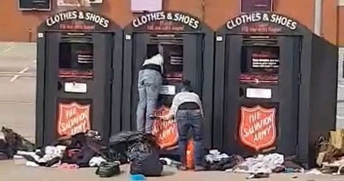 O organizație de caritate a îndemnat persoanele care se luptă în situații „disperate” să caute ajutor după ce a apărut un videoclip care arată două persoane răsfoind prin saci cu haine uzate la un punct de colectare de caritate.