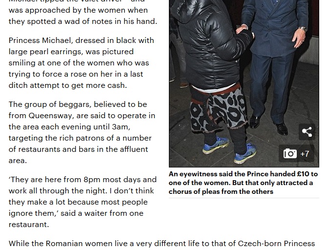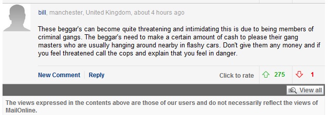 Tabloidul Daily Mail nu rateaza niciodata ocazia daca romanii pot fi implicati pentru a demostra cititorilor lor ca xenophobia lor este justificata. Au publicat o poveste despre un cuplu care a dat 10 lire la o cersetoare.