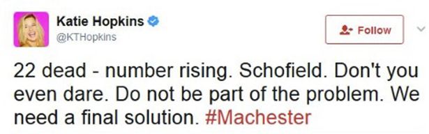 Katie Hopkins, o prezentatoare radio de la LBC radio a fost conciedata dupa ce a scris pe Twitter ca Marea Britanie are nevoie de o ”Soultie Finala” pentru a opri atacurile teroriste. Termenul ”Solutia Finala” a fost folosit de catre Nazisti in timpul razboiului II mondial, cand exterminau sistematic milioane de evrei si tigani.
