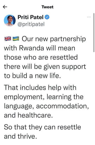 Ministrul de Interne Priti Patel, care a semnat joi un acord de 120 de milioane de lire sterline în capitala Rwandei Kigali, a mai spus că departamentul ei se așteaptă la acțiuni în justiție, dar crede că orice pretenție ar putea fi contestată cu succes.