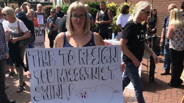 El este deputatul (MP) pentru Burton si Uttoxeter si comportamentul lui a provocat o revolta din partea unor localnici. Grupul s-a adunat cu placarde, cu unul care ii denota ca un “misoginist”.