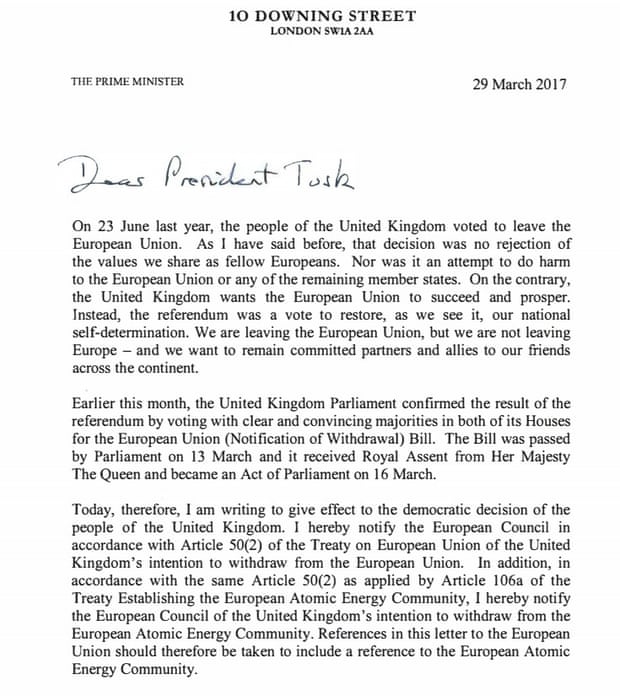 Președintele Consiliului European, Donald Tusk, a primit scrisoarea oficiala prin care Regatul Unit al Marii Britanii declanșează 2 ani de negocieri cu restul Europei. ”Deja ne este dor de voi” a declarat Donald Tusk.