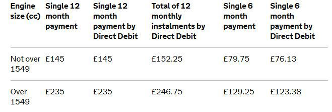 Masini inregistrate iinainte de 1 Martie 2001 se calculeaza dupa marimea motorului – £145/an pentru masinile cu capacitatea cilindrica sub 1549 cc si £235/an pentru masinile cu capacitatea cilindrica de peste 1549 cc. In functie de metoda de plata, DVLA ofera mai multe optiuni, dupa cum se vede in graficul de mai jos.